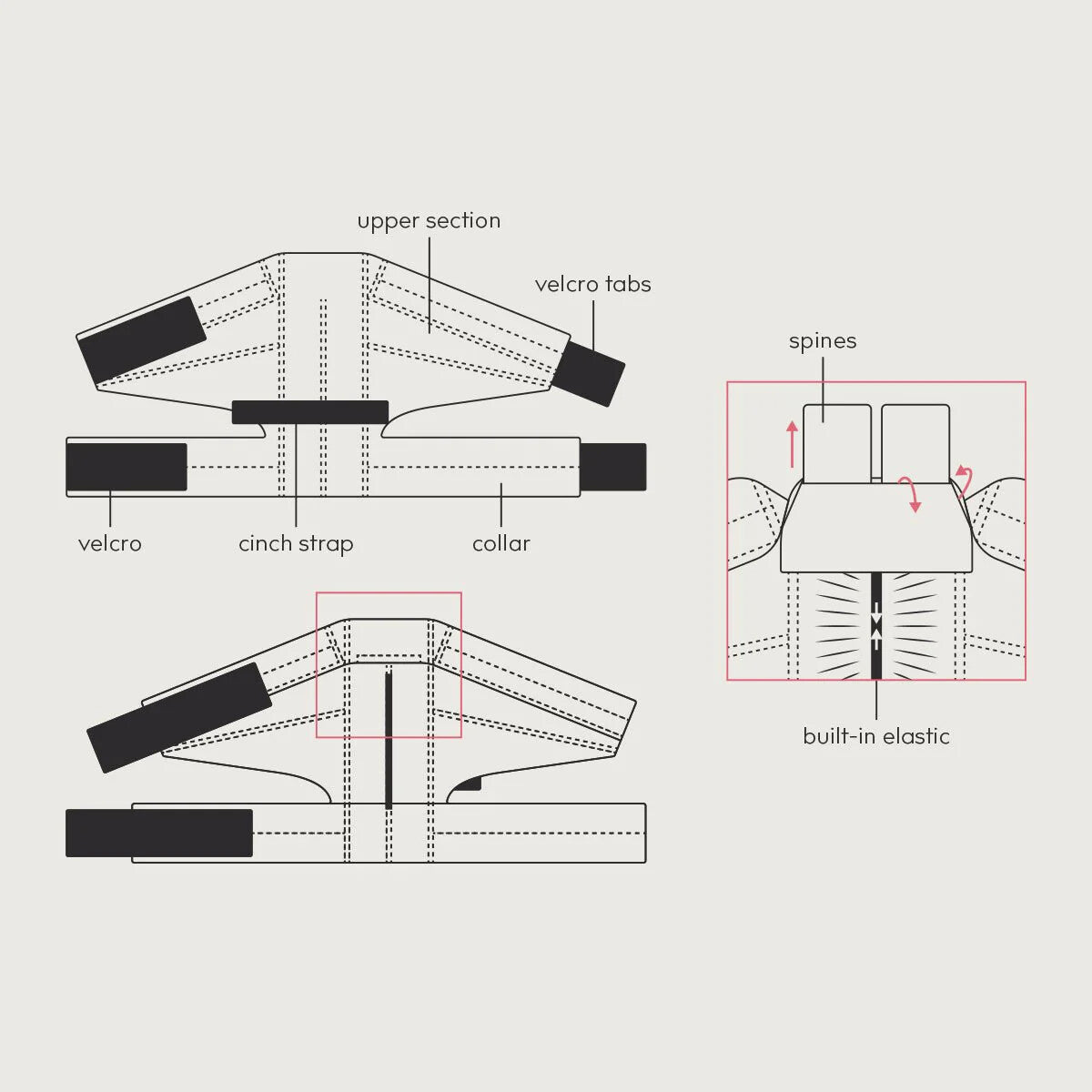 No Flap™ Ear Wrap poate fi reglat pe animal cu ajutorul benzilor Velcro și grație benzilor de plastic flexibil cusute în material împreună cu cureaua reglabilă de pe cap, nu alunecă pe ceafă sau pe față.